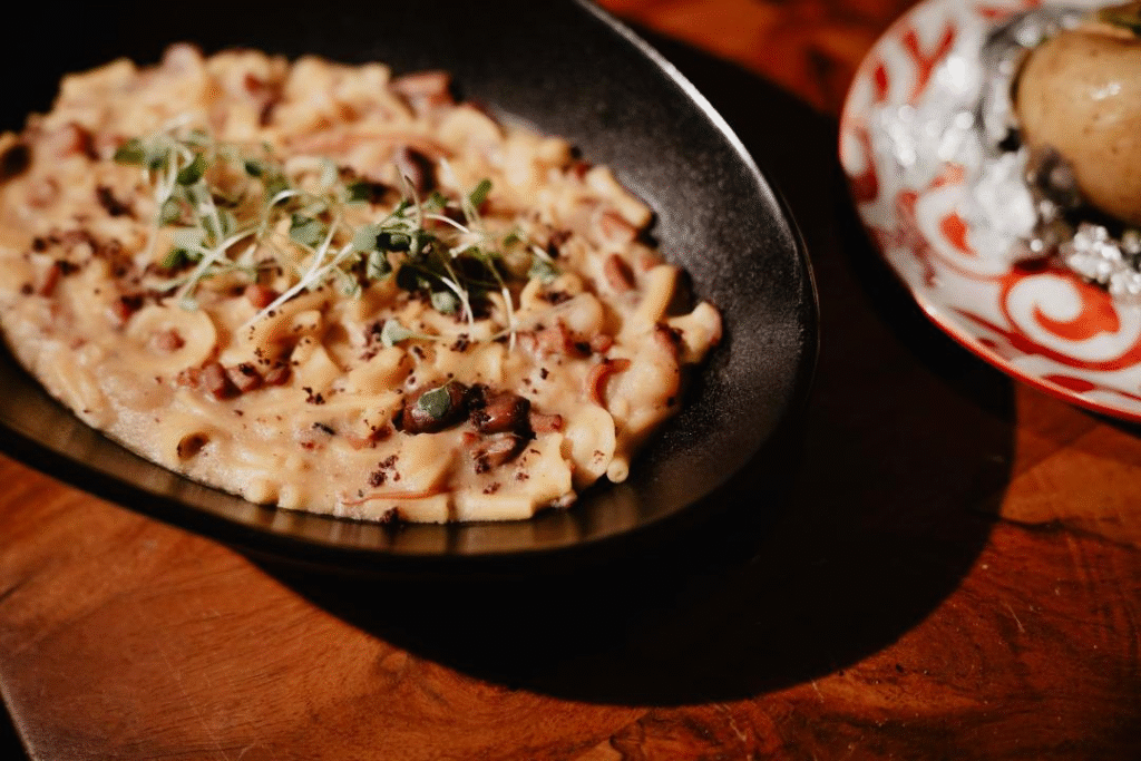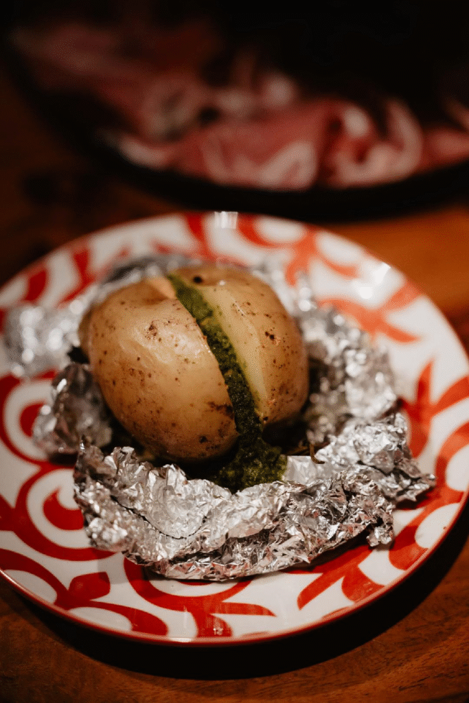 Il menu dello Chef Emanuele Esposito ha accompagnato gli ospiti in un vero e proprio Grand Tour culinario d’Italia, reinterpretando la tradizione con raffinatezza. Si è iniziato con il “Mare a Corte”, una bruschetta che ha richiamato i sapori mediterranei del Sud Italia, con alici, pomodoro, capperi e un tocco esotico di uva sultanina, evocando le scoperte dei viaggiatori. A seguire, la “Mescafrancesca” di pasta con totani, patate e olive nere caiazzane ha celebrato la cucina tradizionale e autentica, tanto apprezzata da chi esplorava la penisola. Un piatto che ha sorpreso per la sua originalità è stata “La patata del Grand Tour”, patata sotto cenere con hummus di ceci e salsa chimichurri, un connubio di sapori che ha suggerito le scoperte culinarie e le influenze multiculturali che i viaggiatori incontravano lungo il loro percorso. Il dessert, la “Nera di Capri”, una caprese al cioccolato con gelato fondente, ha rappresentato una dolce e tipica conclusione, omaggio alla celebre pasticceria campana.